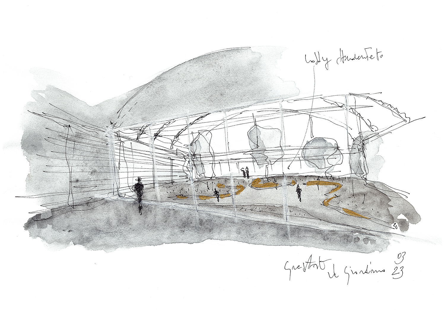 Il nuovo giardino di 600 m², progettato con la paesaggista Laura Gatti, nasce per sottrazione: eliminando coperture e pavimentazioni, conservando solo le strutture originali. Il giardino rappresenta una stratificazione tra spazio interno e aperto, percepito come elemento originario, racchiuso e protetto, evocando l’etimologia del termine “giardino” come recinto e paradiso. Sedute disegnate ad hoc definiscono il bordo delle placche verdi e modellano il terreno, creando un’atmosfera intima e amplificando la luce naturale.